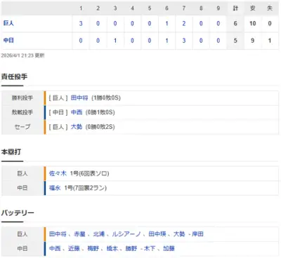 【試合結果】 4/1 中日 5-6 巨人 初登板中西6回途中4失点・・福永一発などで追上も及ばず開幕5連敗・・