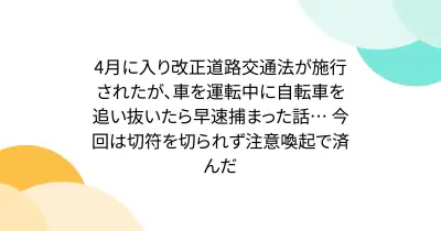 4月に入り改正道路交通法が施行されたが、車を運転中に自転車を追い抜いたら早速捕まった話… 今回は切符を切られず注意喚起で済んだ