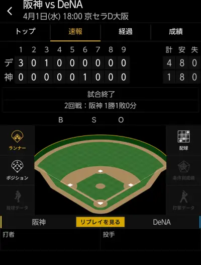 【試合結果】[2026/4/1] DeNAベイスターズ4-1阪神タイガース DeNA待望の今季1勝 相川新監督が初勝利 開幕からの連敗を4でストップ