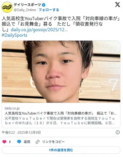 【YouTuber】バイク事故で入院のゆたぼん、振込で「お見舞金」募る