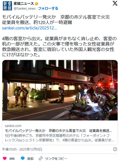 【京都】モバイルバッテリーが発火か ホテルで出火、宿泊客120人が一時避難する騒ぎに