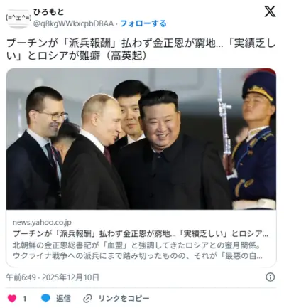 【悲報】ロシア「北朝鮮兵の成果乏しいから報酬は約束の2割ね」 ロケットマン激怒へ