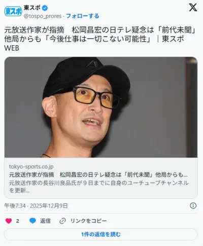 元放送作家が松岡昌宏の日テレ疑念に「批判めいた発言、前代未聞」「降板覚悟か」他局からも「仕事は一切こない可能性」
