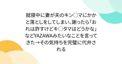 就寝中に妻が夫のキン◯マにかかと落としをしてしまい、謝ったら「おれは許すけどキ◯タマはどうかな」などYAZAWAみたいなことを言ってきた→その気持ちを完璧に代弁される