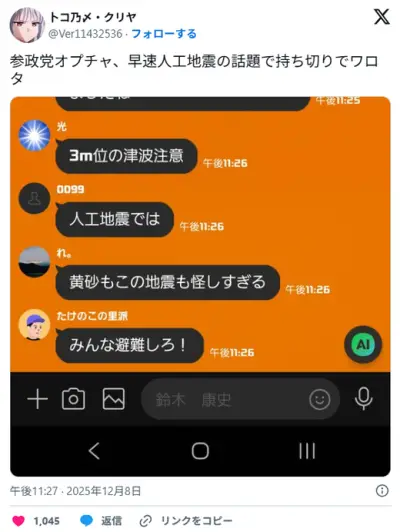 【朗報】参政党オープンチャット、人工地震の話題で持ちきりになる