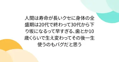 人間は寿命が長いクセに身体の全盛期は20代で終わって30代から下り坂になるって早すぎる、歯とか10歳くらいで生え変わってその後一生使うのもバグだと思う