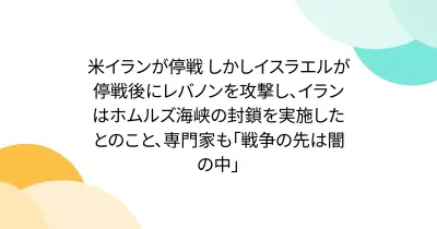 米イランが停戦 しかしイスラエルが停戦後にレバノンを攻撃し、イランはホムルズ海峡の封鎖を実施したとのこと、専門家も「戦争の先は闇の中」