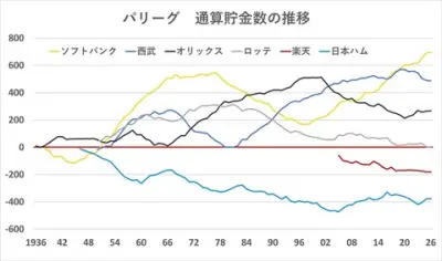 ロッテが球団創設以来初の通算成績負け越しで1度も負け越しがないのは阪神だけに