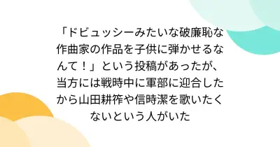 「ドビュッシーみたいな破廉恥な作曲家の作品を子供に弾かせるなんて!」という投稿があったが、当方には戦時中に軍部に迎合したから山田耕筰や信時潔を歌いたくないという人がいた