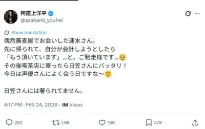 人気男性声優(34)「蕎麦屋で偶然会った速水さんは奢ってくれたけど、その後喫茶店で偶然会った日笠さんは奢ってくれなかった・・・」