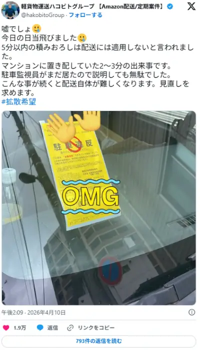 高級タワマンに配達していたamazon、軽バンに戻ると駐禁が貼られ日当が飛び号泣