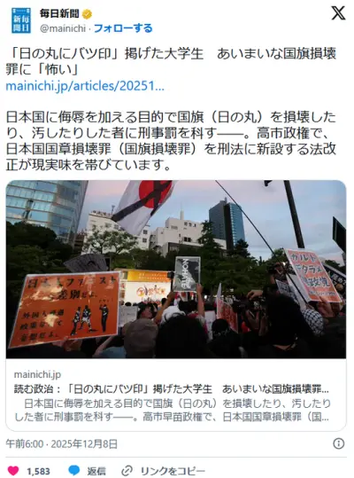 「日の丸にバツ印」掲げた大学生 あいまいな国旗損壊罪に「怖い」 The Mainichi