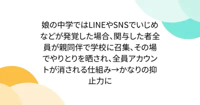娘の中学ではLINEやSNSでいじめなどが発覚した場合、関与した者全員が親同伴で学校に召集、その場でやりとりを晒され、全員アカウントが消される仕組み→かなりの抑止力に