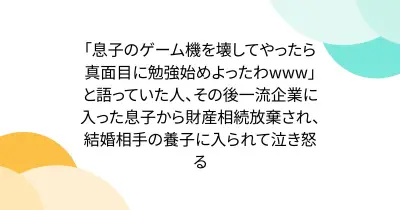 「息子のゲーム機を壊してやったら真面目に勉強始めよったわwww」と語っていた人、その後一流企業に入った息子から財産相続放棄され、結婚相手の養子に入られて泣き怒る