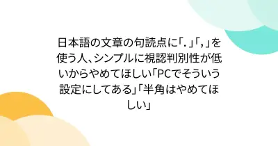 日本語の文章の句読点に「.」「,」を使う人、シンプルに視認判別性が低いからやめてほしい「PCでそういう設定にしてある」「半角はやめてほしい」