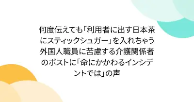 何度伝えても「利用者に出す日本茶にスティックシュガー」を入れちゃう外国人職員に苦慮する介護関係者のポストに「命にかかわるインシデントでは」の声