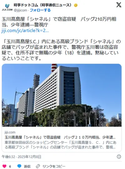 【東京】玉川高島屋「シャネル」で窃盗容疑 バッグ210万円相当、無職少年(18)逮捕 買い取り店で身分証提示できず売却失敗