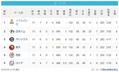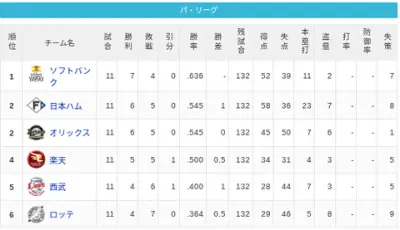 【4/8】パ・リーグ順位表|混パの予感…日ハムの現在順位がこちら
