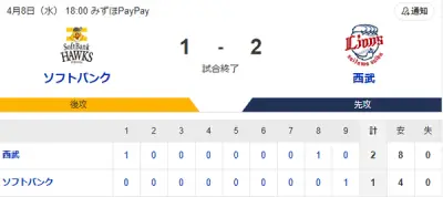 【ソフトバンク対西武2回戦】西武がソフトバンクにヒヤリ2連勝 借金3に!髙橋光成が快投 8回2安打11Kの無失点で今季初白星 小島&渡部が援護弾 岩城が9回1失点も