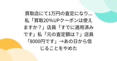 買取店にて1万円の査定になり...私「買取20%UPクーポンは使えますか?」店員「すでに適用済みです」私「元の査定額は?」店員「8000円です」→あの日から信じることをやめた