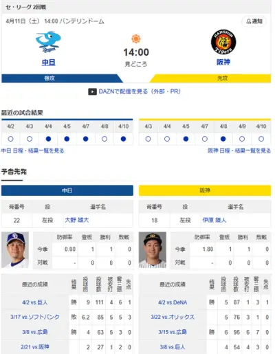 【ドラゴンズ実況】4/11 中日vs阪神(バンテリンD)14:00~先発:大野雄大 【中継:東海TV Jスポ2 DAZN他】
