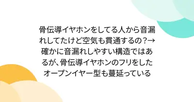 骨伝導イヤホンをしてる人から音漏れしてたけど空気も貫通するの?→確かに音漏れしやすい構造ではあるが、骨伝導イヤホンのフリをしたオープンイヤー型も蔓延っている