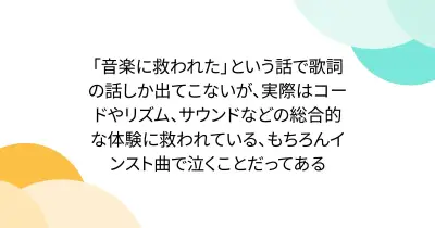 「音楽に救われた」という話で歌詞の話しか出てこないが、実際はコードやリズム、サウンドなどの総合的な体験に救われている、もちろんインスト曲で泣くことだってある