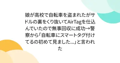 娘が高校で自転車を盗まれたがサドルの裏をくり抜いてAirTagを仕込んでいたので無事回収に成功→警察から「自転車にスマートタグ付けてるの初めて見ました...」と言われた