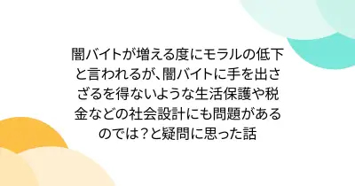 闇バイトが増える度にモラルの低下と言われるが、闇バイトに手を出さざるを得ないような生活保護や税金などの社会設計にも問題があるのでは?と疑問に思った話