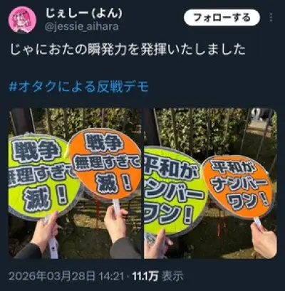 【擬態】「じゃにおたの瞬発力を発揮いたしました」オタクによる反戦デモにうちわ持参→ジャニオタエアプがバレて鍵垢逃亡wwwww