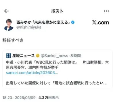【炎上】社民党・西みゆか、WBC観戦した閣僚に「辞任すべき」とイチャモン→ポスト削除して逃亡wwwww