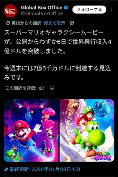 映画「マリオギャラクシー」月曜日に4億ドル突破!今週7億5000万ドルの見込み!