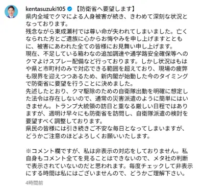 秋田知事、クマ被害で自衛隊派遣検討要望へ