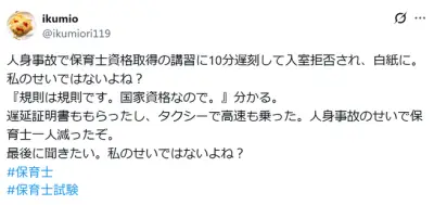 【悲報】人身事故で遅れた人、保育士資格取得の講習が受けられなかった模様