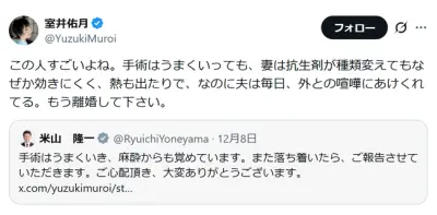 【悲報】米山隆一さん、妻・室井佑月が入院中でもレスバしすぎて離婚切り出される
