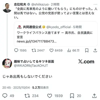 【速報】共同通信 馬車馬「国民には強いないで」高市氏発言が波紋