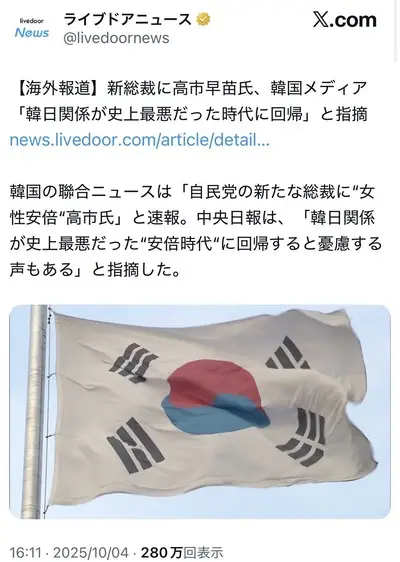 【速報】新総裁に高市早苗氏、韓国メディア「韓日関係が史上最悪だった時代に回帰」
