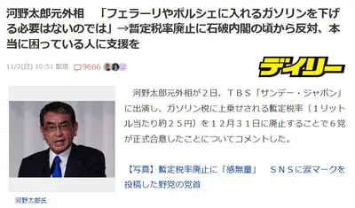 【速報】河野太郎元外相「フェラーリやポルシェに入れるガソリンを下げる必要はないのでは」暫定税率廃止に反対、本当に困っている人に支援を