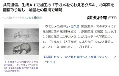 共同通信、社内指針で原則禁止している生成AI画像を作って記事にしていることが外部指摘より判明 オールドメディアにより作られた報道「子ガメをくわえるタヌキ」がこちら