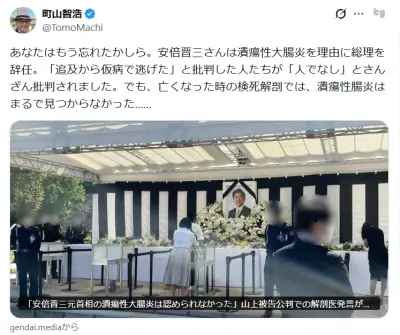 【速報】有名映画評論家・町田氏、「故・安倍晋三氏の検死解剖で潰瘍性腸炎は見つからなかった」ネット記事をミスリードして引用で炎上