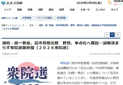 【速報】時事通信「支持率下げてやる!!」→「高市が統一問題で沈黙したせいで論戦が深まらない!!」