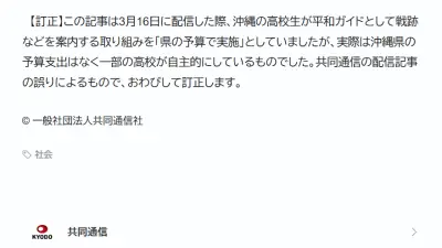 【速報】共同通信「『平和学習 来県した生徒らを沖縄の高校生ら案内、県の予算で実施』は共同通信の配信記事の誤りによるものでした」