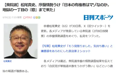 【速報】俳優松尾貴史「日本の有権者はマゾ」「本当に地獄の一丁目の『際』まで来た日本国」