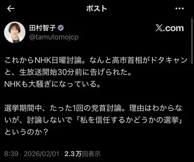 共産党・田村「NHK日曜討論、なんと高市首相が放送30分前にドタキャン!現場大騒ぎ」→代理の自民田村が説明「高市首相は遊説中に痛めて治療検査※関節リウマチ持ち」