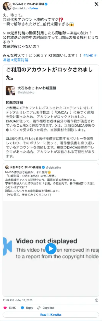 れいわ大石、NHK動画切り抜き削除に「『引用』の範囲内で、著作権侵害には当たらないはずでは?」→再投稿も削除されオマケに繰り返したとしてアカウントロック