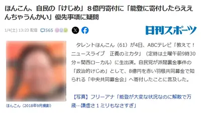 ほんこん、自民の「けじめ」8億円寄付に「能登に寄付したらええんちゃうんかい」優先事項に疑問