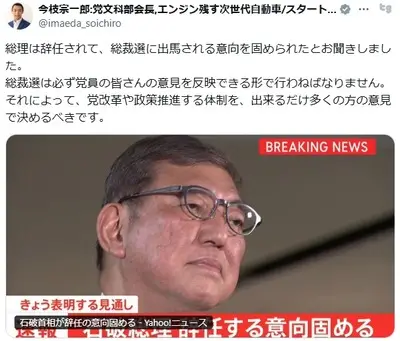 【速報】石破首相、総裁選に出馬※ソースは:今枝宗一郎衆議院議員 共同「出馬しない見通し」