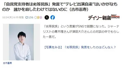 古市氏「劣等民族発言でテレビ出演自粛はいかがなものか。違和感持った人は言葉で反論すればいい」