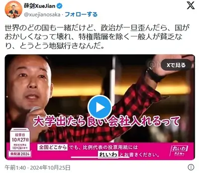 【速報】中国在大阪総領事、選挙活動に介入か れいわ新選組の選挙宣伝動画を拡散