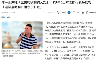 【パヨ逝く】れいわ山本太郎代表、応援演説で沖縄県入り「オール沖縄は選挙互助会に落ちぶれ、歴史的役割終えた」もう何と戦ってるんだよw